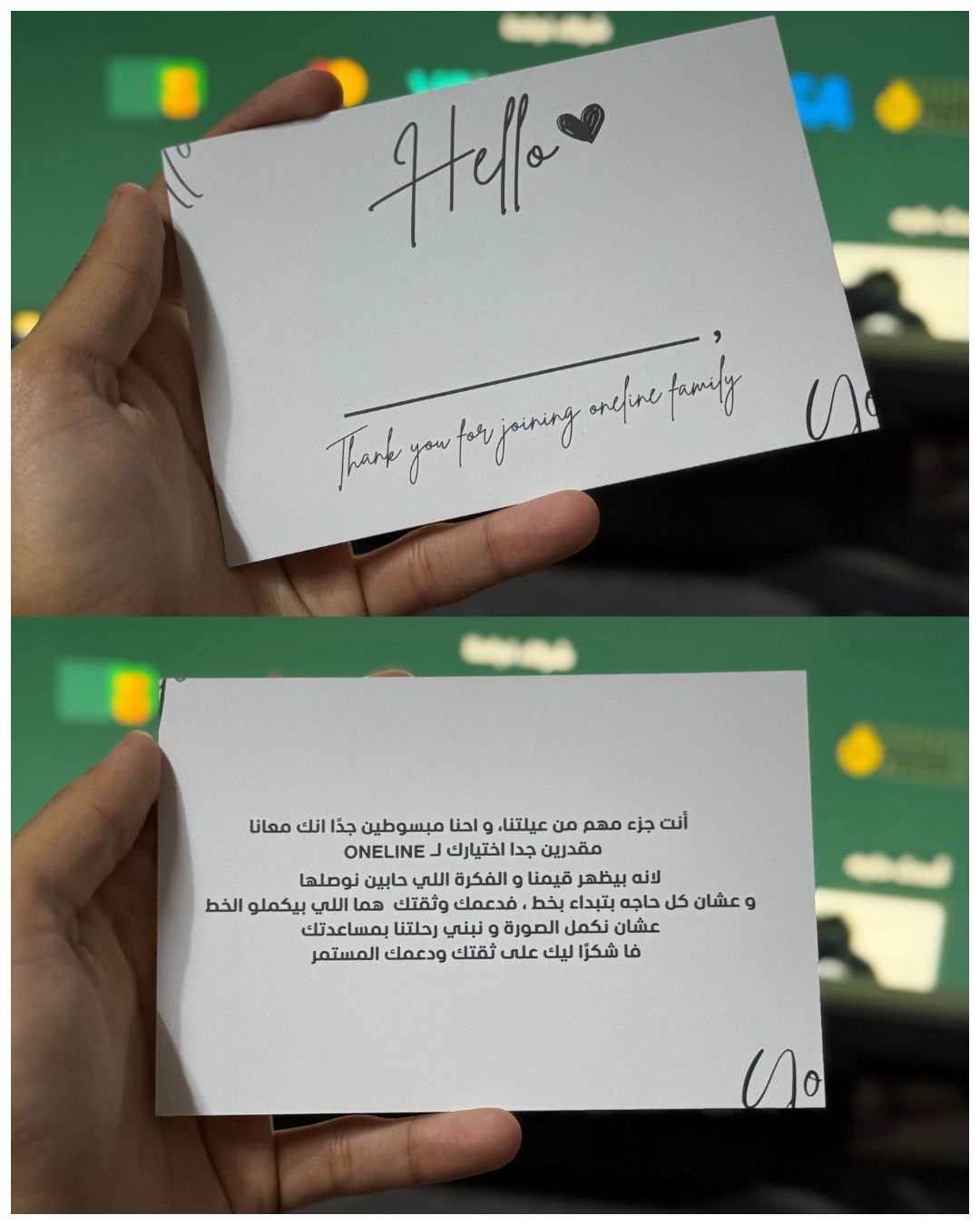 "تفاصيل صغيرة، بس معناها كبير! 🖤 كل طلب من One Line بييجي مع كارت شكر لأنك جزء من رحلتنا."